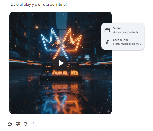 En pocos segundos aparecerá el reproductor con la pista generada. Desde ahí podrás escuchar el resultado, volver a generar otra versión o ajustar el prompt para cambiar el estilo.