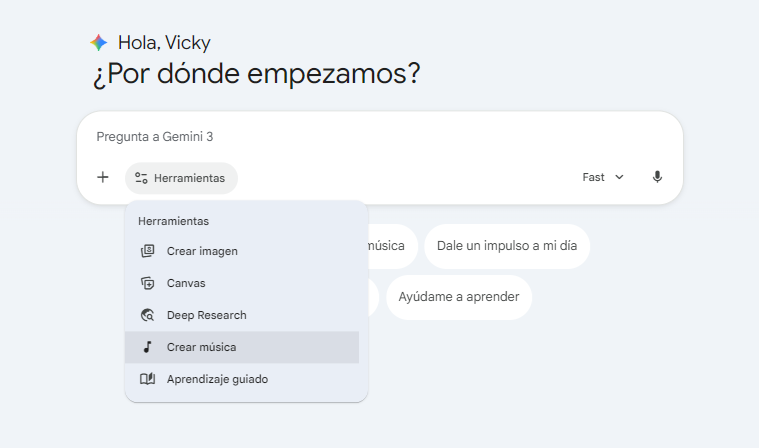Primero de todo deberás seleccionar la herramienta correcta para crear música, desde la consola de prompt de Gemini puedes hacerlo: