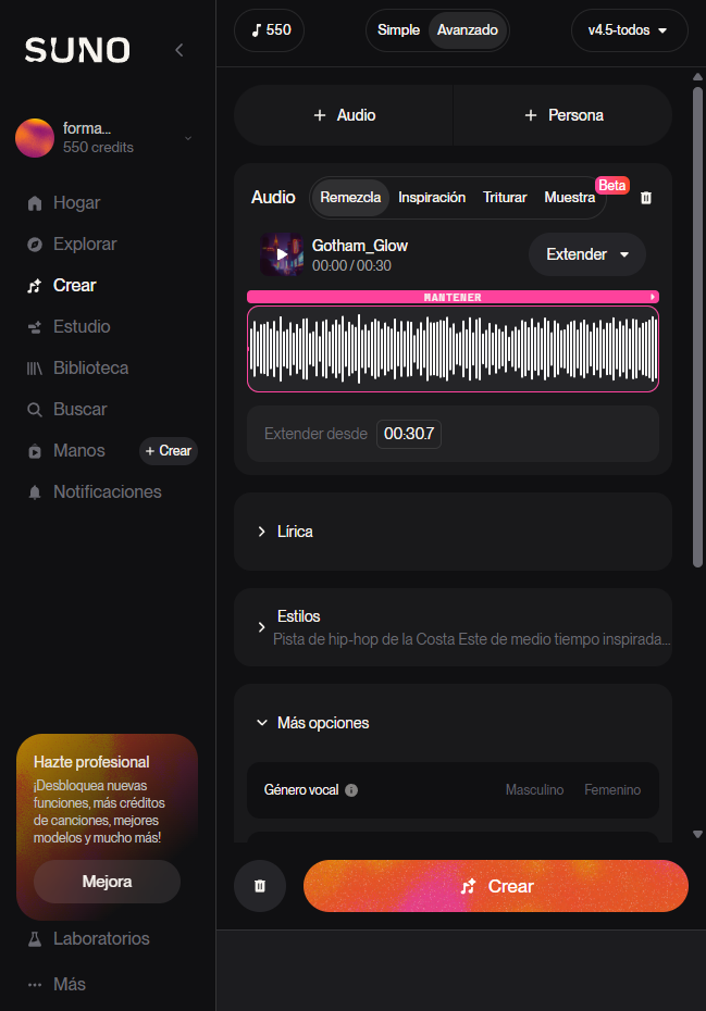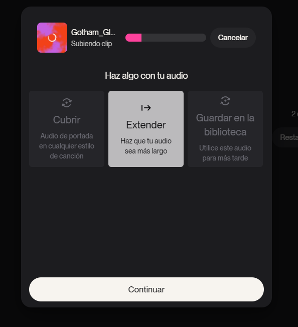Luego cuando hayas cargado el audio tienes varias opciones, en este caso queremos extender la pista, prepara y personaliza tu experiencia dentro de Suno.