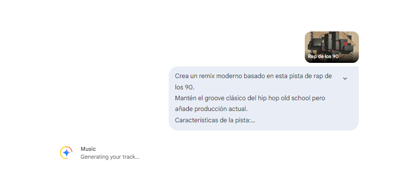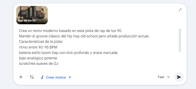 Una vez elegida la pista base, puedes personalizarla escribiendo instrucciones en el campo de texto. Aquí es donde defines el tipo de remix que quieres generar.